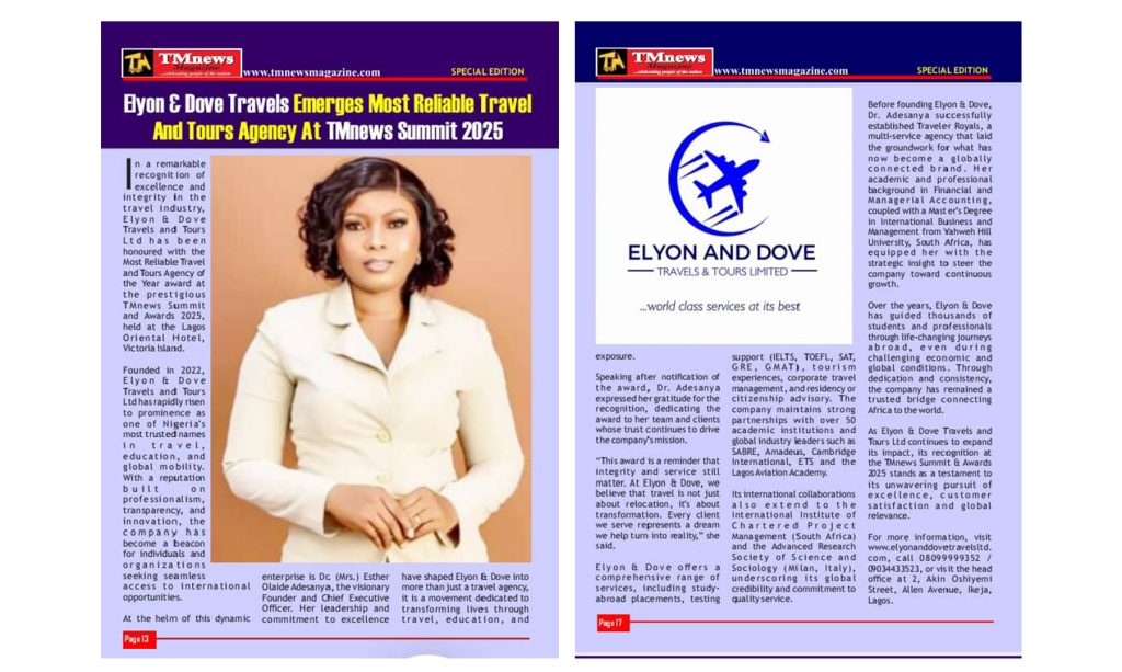 Elyon & Dove Travels Emerges Most Reliable Travel And Tours Agency 2025